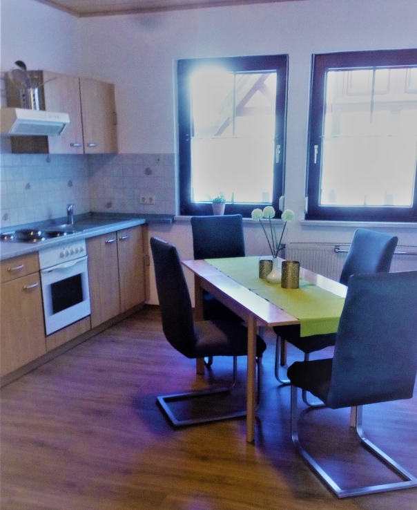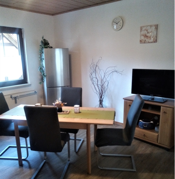 Die Wohnküche bzw. der Aufenthaltsraum ist etwa 20m² groß. Hier findet sich ein Esstisch mit vier Stühlen. Für Ihre Unterhaltung sorgt ein TV-Gerät, eine kleine Auswahl an Büchern sowie eine Stereo-Anlage.